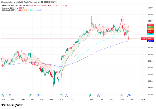 마이크로소프트 주가는 최근 52주 고점인 $555에서 11.46% 하락했습니다. 이 하락을 두고 시장에서는 '저가 매수 기회'라는 주장과 '추가 하락의 신호'라는 주장이 팽팽하게 맞서고 있습니다.